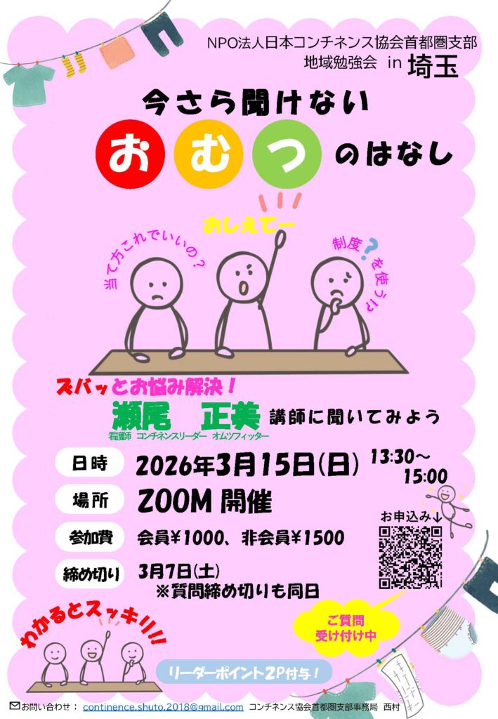 問い合わせ:NPO法人日本コンチネンス協会首都圏支部事務局 西村